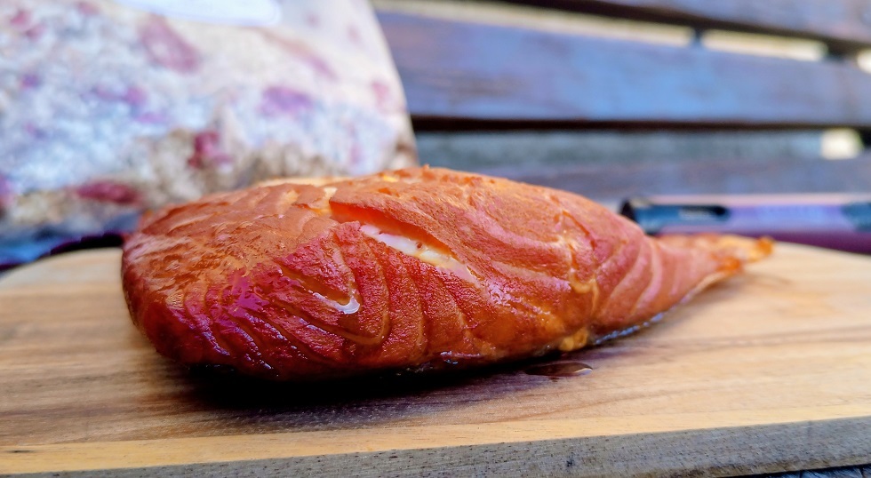 - Nech lososa oschnout 1–2 hodiny v lednici nebo na chladném místě – vytvoří se jemná lepkavá vrstva (pelikula), která dobře chytá kouř.