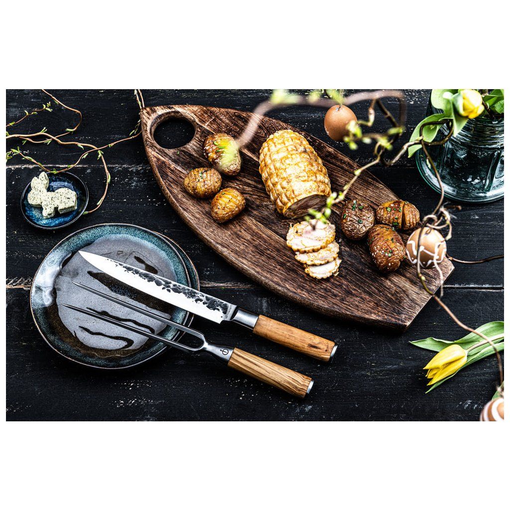 Spojení nerezové oceli SS304, výrazného ručního vzhledu a rukojeti z olivového dřeva vytváří nástroj, který nejen dobře funguje, ale zároveň skvěle vypadá. Nejlépe si rozumí s nožem na maso ze stejné řady, se kterým tvoří sehranou dvojici pro porcování i servírování.